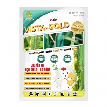 Thuốc trừ bệnh VISTA GOLD: Công thức kép Flutriafol và Tricyclazole giúp đặc trị đạo ôn trên lúa, thấm sâu, lâu dẫn hai chiều nhanh, tăng suất đề kháng, năng suất cao. Tuột lá chân (Lá ủ), bảo vệ 3 lá đòng, giúp lá xanh, bông sáng, hạt chắc.